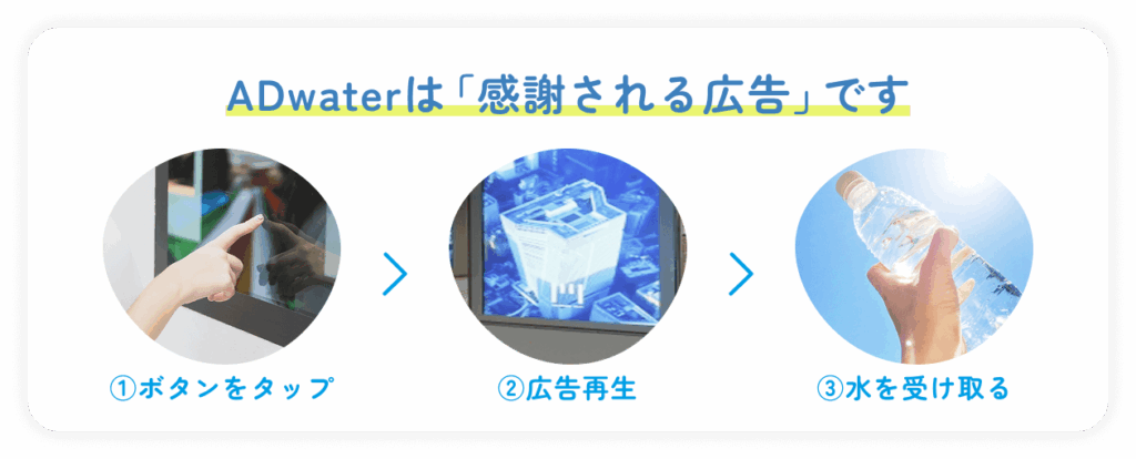 ADwater(特許出願中)では、広告の最後に「この水は株式会社〇〇があなたに届けています。」